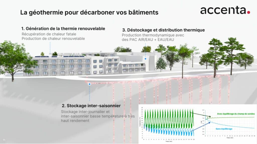 ACCENTA, société adhérente du CD2E, est venue présenter son retour d’expérience sur l’hybridation solaire thermique + géothermie avec géostockage.