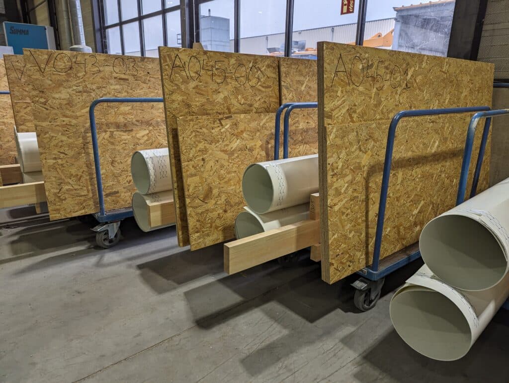 Rawblox fabrique des éléments structurels de murs, de planchers et de toits en paille. La base est constituée à 5 % de paille, elle est pressée dans une ossature en bois, ce sont les 5 % restants. La finition est une couche de base de stuc d’argile sur le mur intérieur et de stuc de chaux à l’extérieur. Si l’on souhaite donner un autre aspect au mur extérieur, il est possible d’installer un autre revêtement sans perdre les caractéristiques uniques du mur. Rawblox produit jusqu’à 26 m2 de panneaux en 8 heures avec 4 ETP sur la ligne de production actuelle. En supposant une maison unifamiliale standard de 110 m2, la surface du sol, des murs et du toit est de 450 m2. Cela équivaut à un délai d’exécution de 17 jours ouvrables par maison.