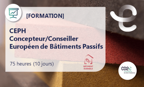 La nouvelle formation diplômante CEPH (Concepteur Européen PassivHaus) du Passiv Haus Institut (PHI), dispensée par les pionniers français du Bâtiment Passif, dure 10 jours répartis sur 3 mois. Elle apporte tous les éléments nécessaires à la conception de bâtiments ultra performants, et traite les aspects techniques (enveloppe, ventilation, ECS, fenêtres), le calcul thermique sur le logiciel PHPP et les aspects économiques.