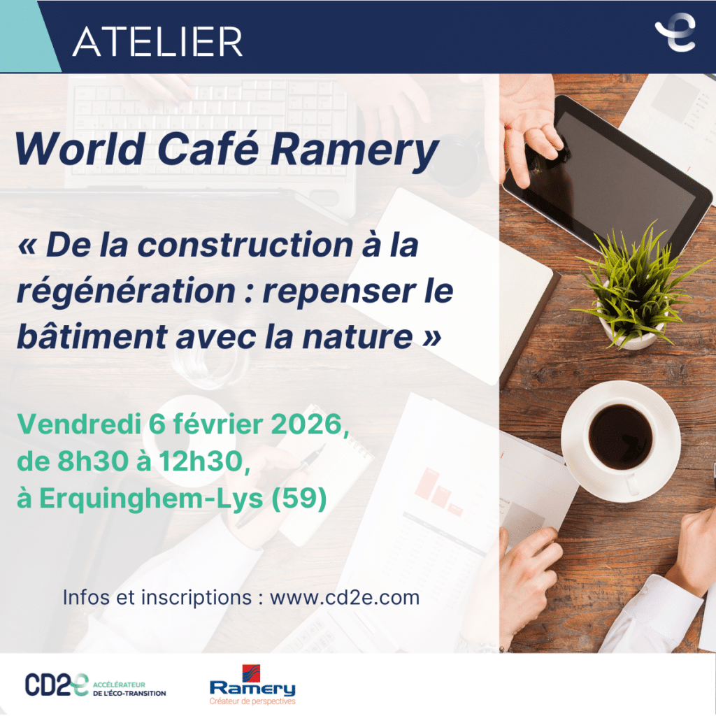 L’entreprise Ramery et son partenaire CD2E organisent un World Café dédié à l’intégration des ressources naturelles – eau, biodiversité, sols – dans le bâtiment de demain, en construction comme en rénovation.