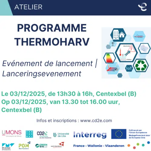 Op 3 december stellen we tijdens het launch event van het ThermoHarv-project nieuwe ideeën en technologieën voor rond energie-efficiëntie, thermo-elektriciteit en circulair design. Ontdek hoe restwarmte kan worden omgezet in bruikbare elektriciteit.