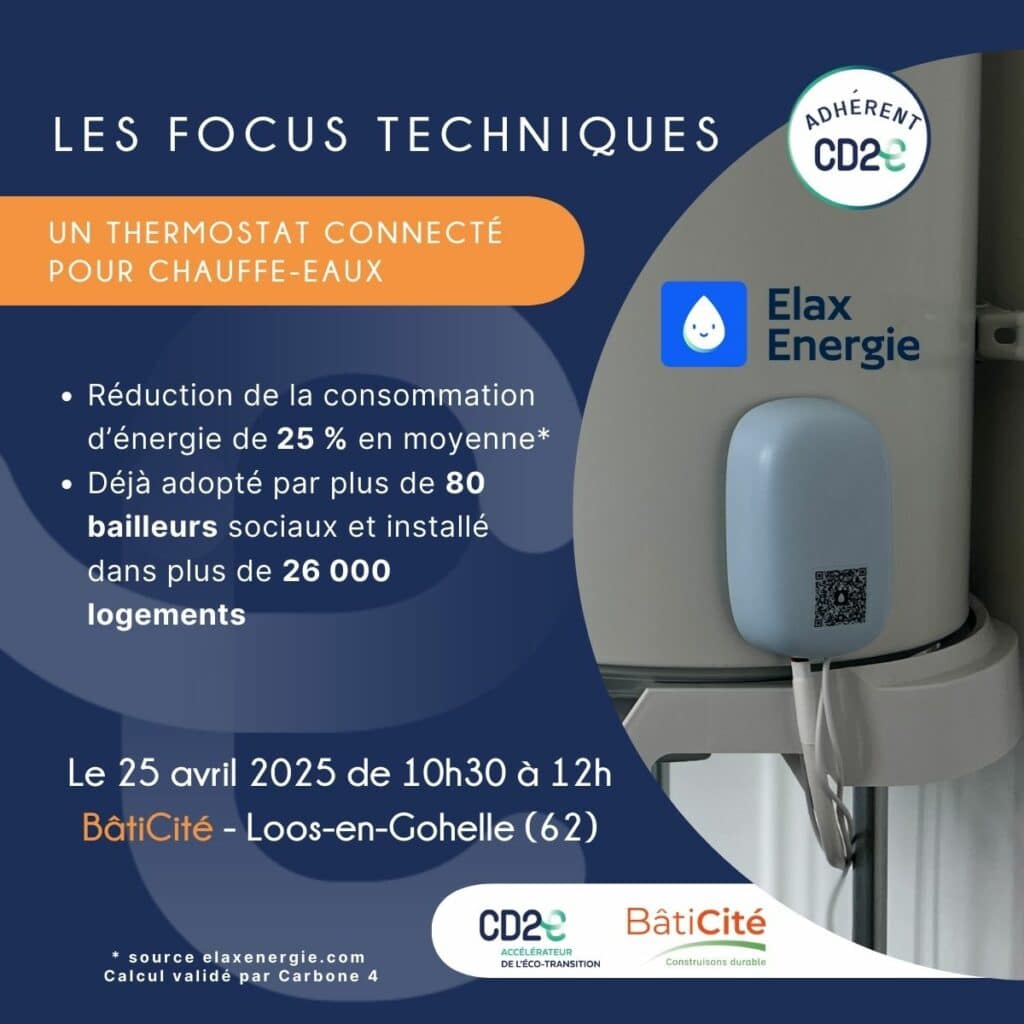 Elax Énergie, start-up française innovante et membre du réseau adhérents CD2E a développé un thermostat connecté pour chauffe-eaux permettant de réduire leur consommation d’énergie de 25 % en moyenne (chiffre validé par le cabinet Carbone 4). Déjà adopté par plus de 80 bailleurs sociaux et installé dans plus de 26 000 logements, il offre une solution simple et efficace pour maîtriser les dépenses énergétiques.