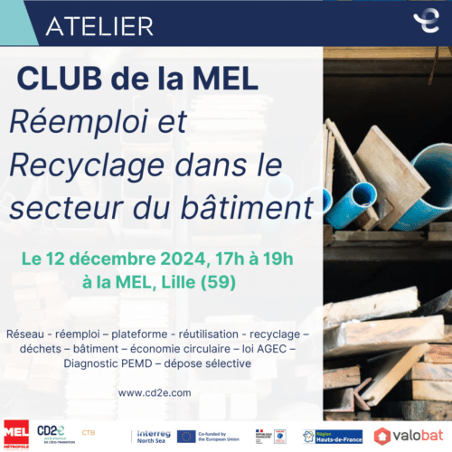 Depuis 2022, la MEL soutient le CD2E qui anime un club d’entreprises sur le réemploi et le recyclage dans le bâtiment, dans le but de favoriser l’information, le partage des bonnes pratiques et de répondre aux difficultés des acteurs.