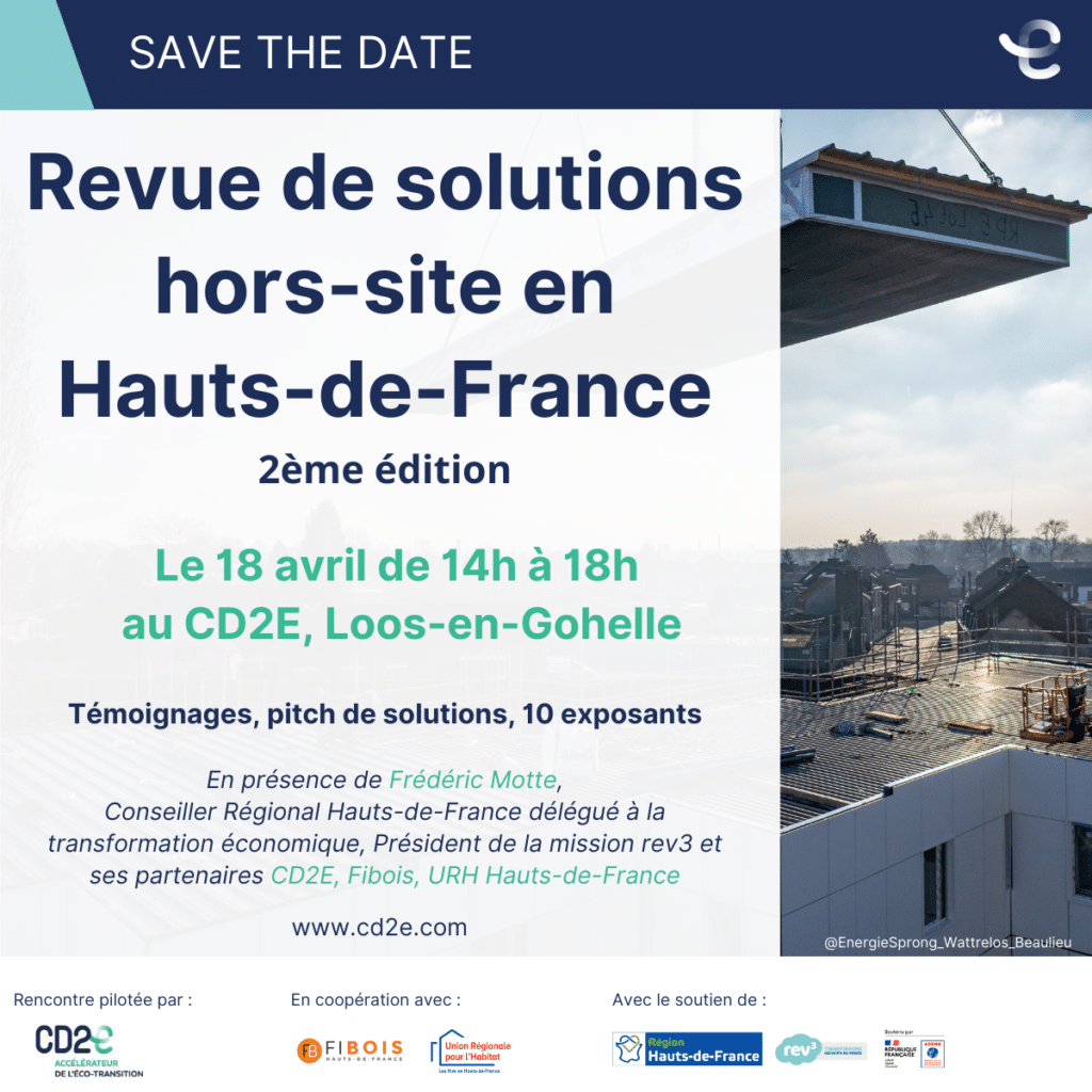 Dans le cadre du déploiement du Hors-site en région Hauts-de-France, le CD2E, missionné par la Région dans le cadre de rev3 et pilote sur le sujet, invite les industriels, entreprises, maîtres d’œuvres, architectes, … à pitcher leur solution Hors Site aux décideurs régionaux (bailleurs, collectivités, …).