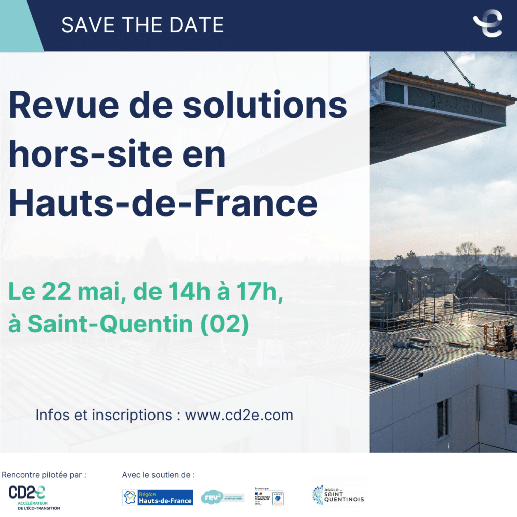 Dans le cadre du déploiement du Hors-site en région Hauts-de-France, le CD2E, missionné par la Région dans le cadre de rev3 et pilote en région sur le sujet, invite les industriels, entreprises, maîtres d’œuvres, architectes, … à pitcher leur solution Hors Site auprès décideurs régionaux (bailleurs, collectivités, …).