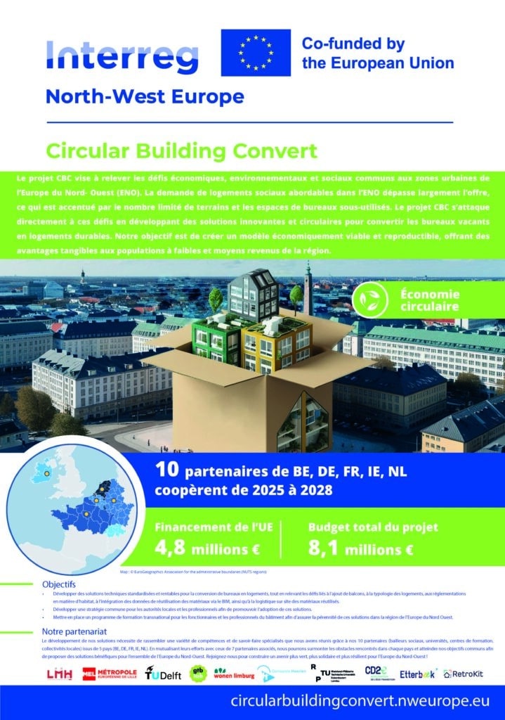 Face à la pénurie de logements abordables et à la vacance croissante des bureaux des années 70 à 90, le projet Circular Building Convert propose une solution innovante : la conversion de bureaux en logements sociaux et abordables en appliquant des principes d’économie circulaire. Financé par Interreg North-West Europe, ce projet pilote vise à démontrer la faisabilité technique et économique de ces transformations tout en intégrant le réemploi des matériaux et en réduisant l’impact environnemental.